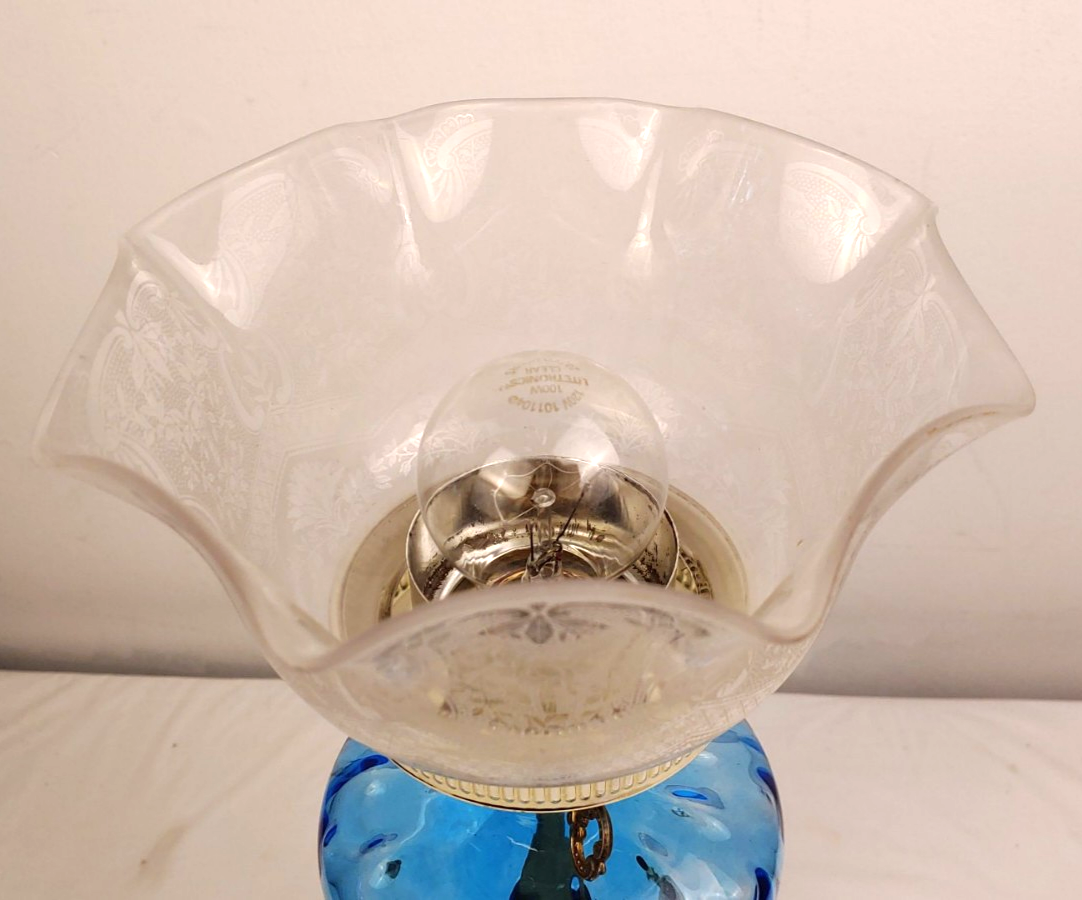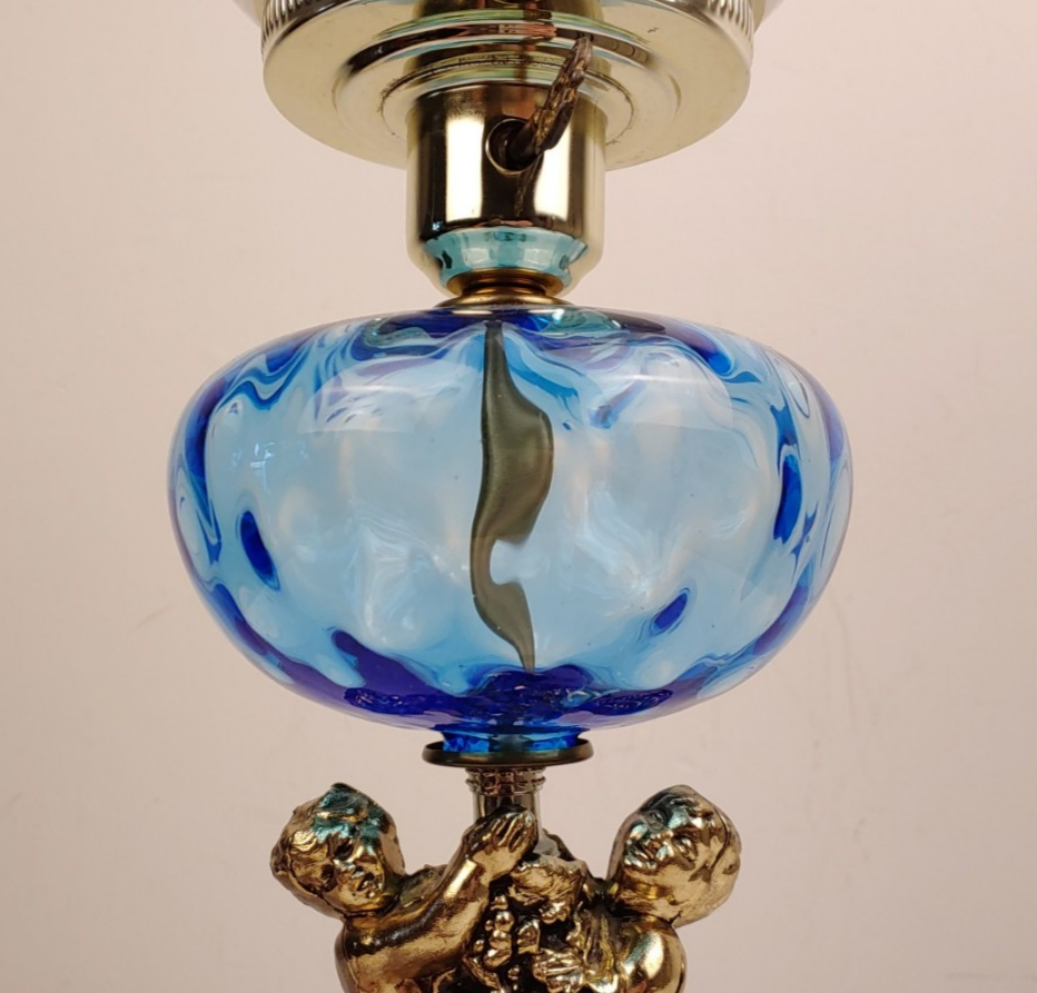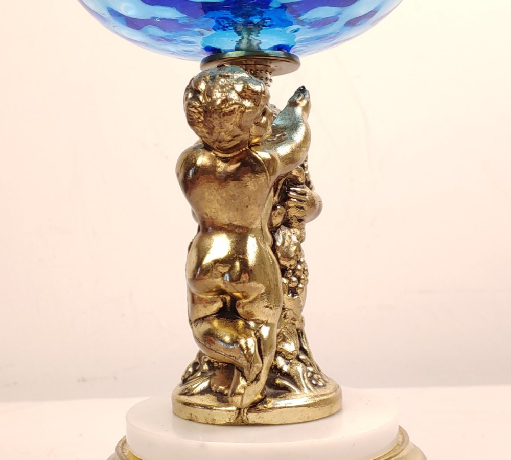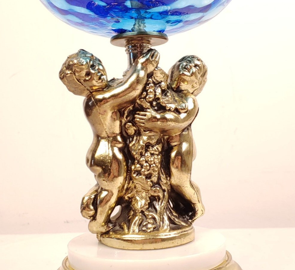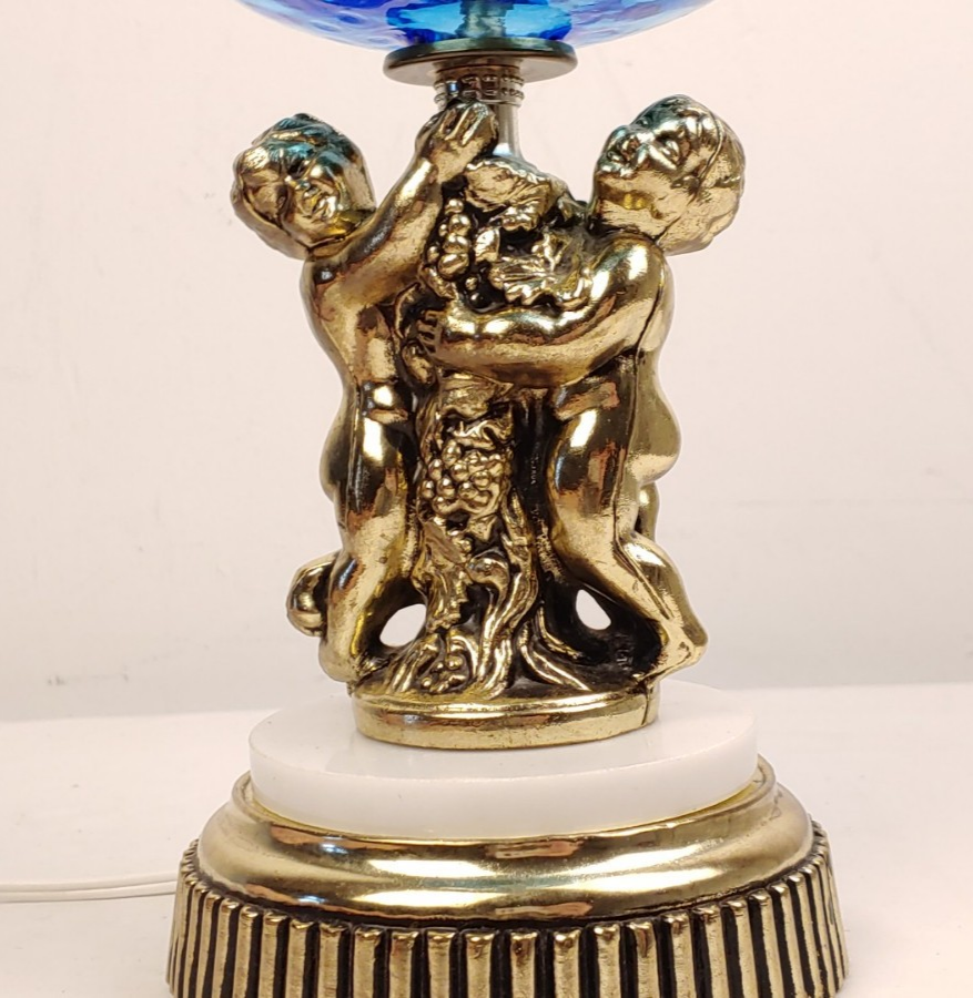 VTG Cherub Parlor Lamp Blue Optic Glass Marble Base Acid Etched Shade Regency
