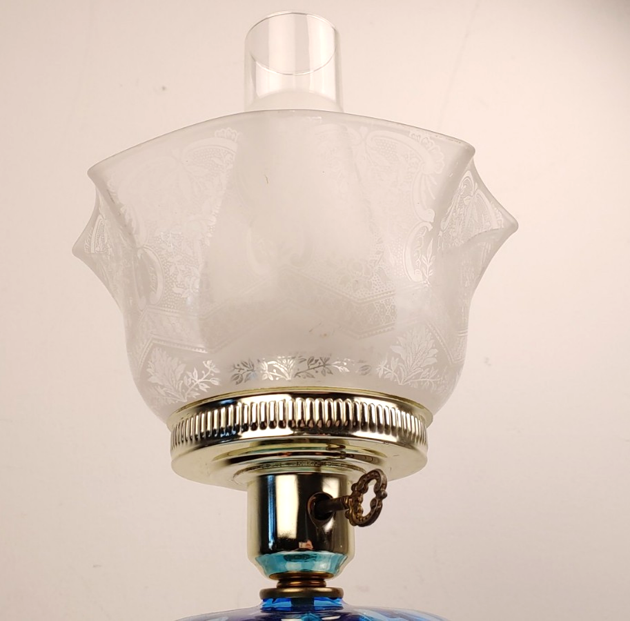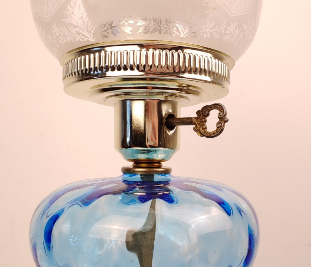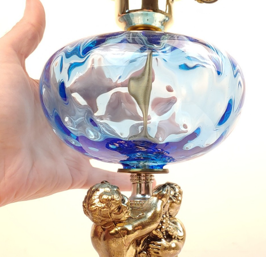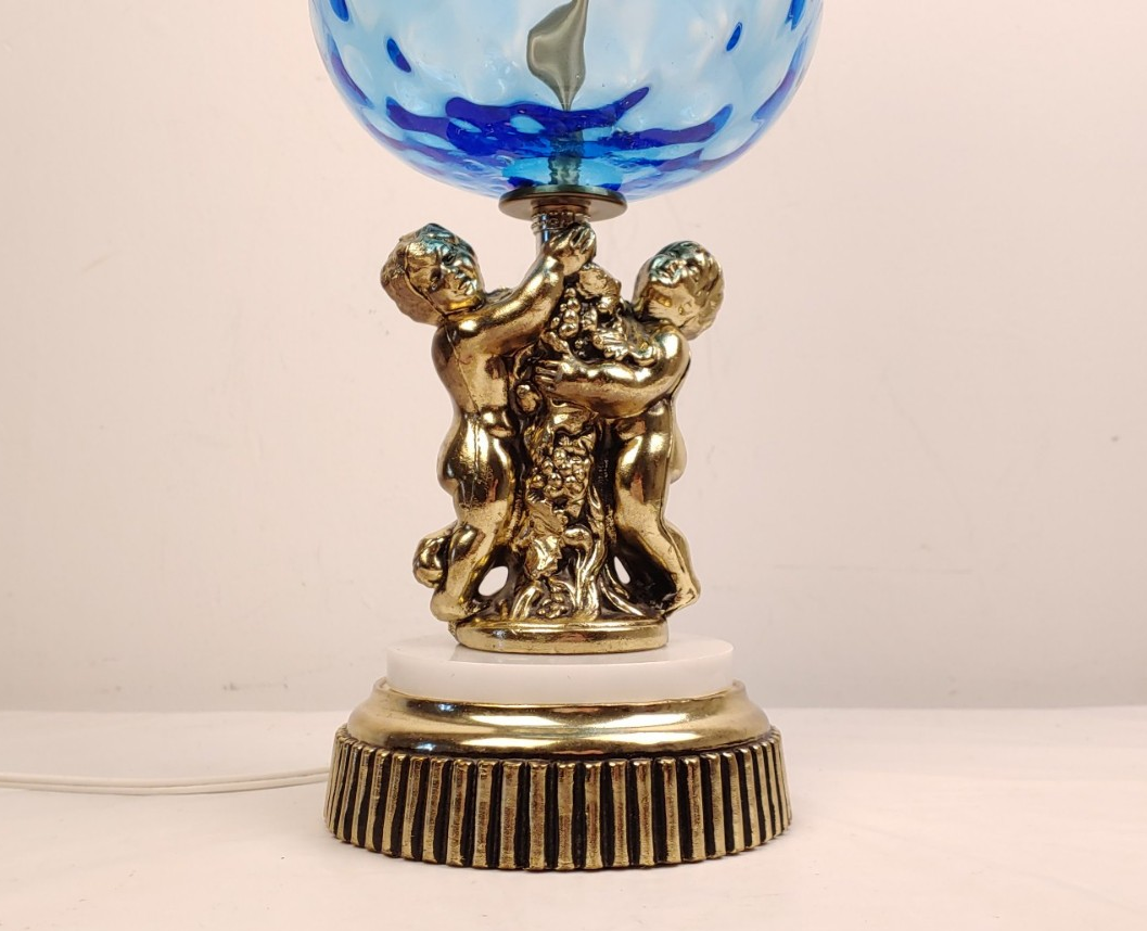VTG Cherub Parlor Lamp Blue Optic Glass Marble Base Acid Etched Shade Regency