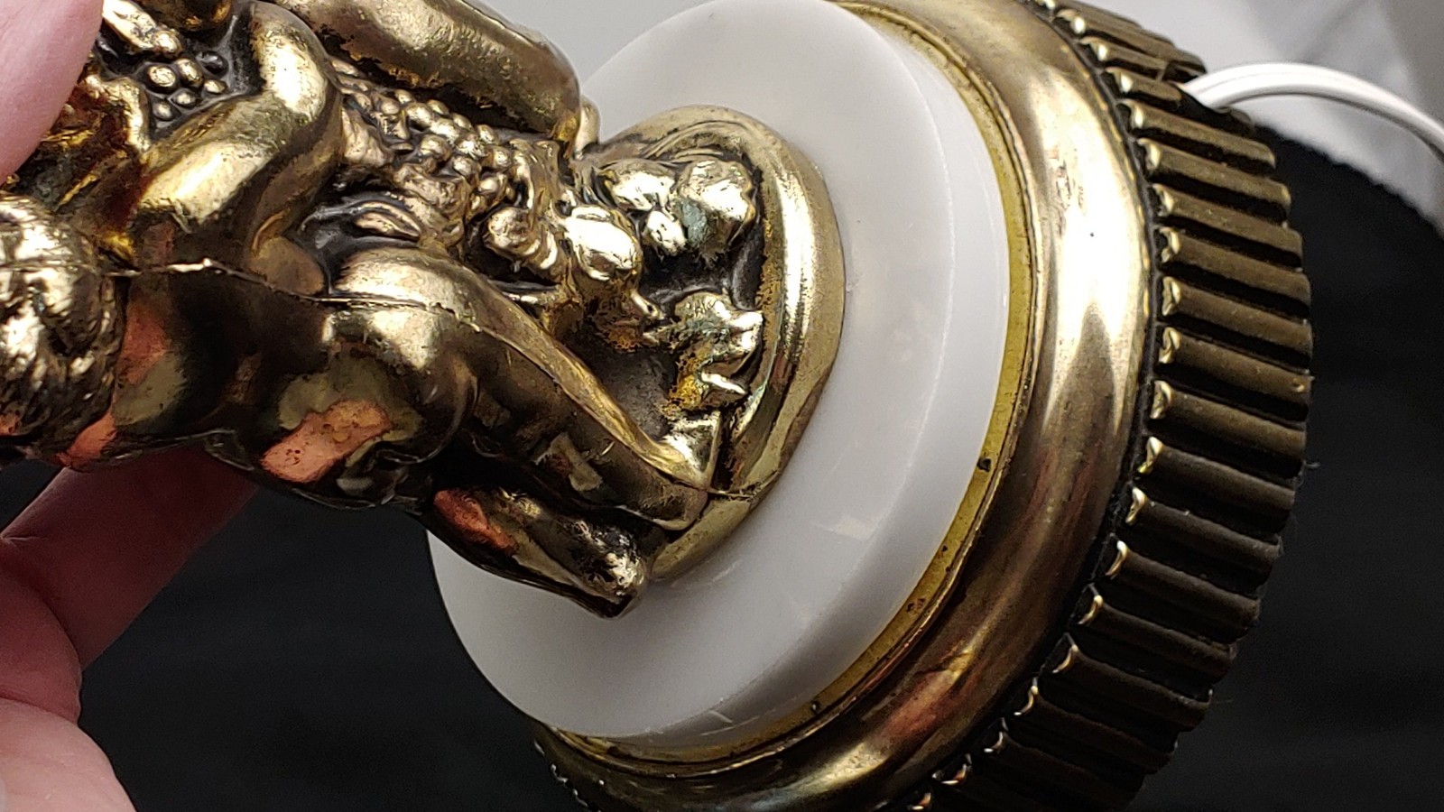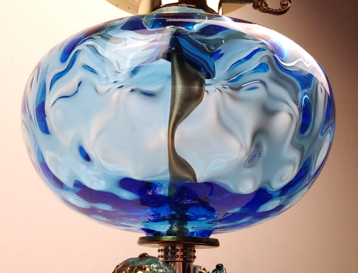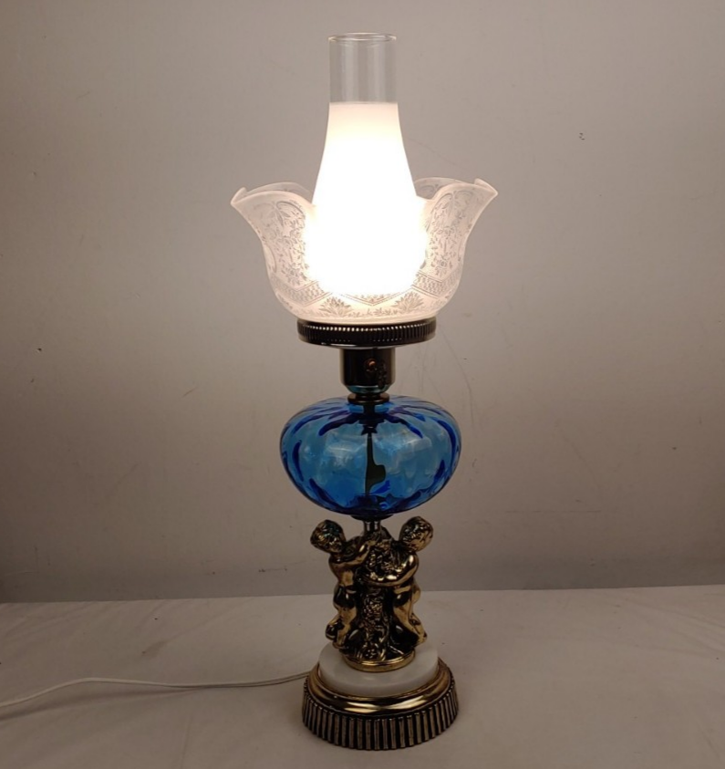 Be the first to review “VTG Cherub Parlor Lamp Blue Optic Glass Marble Base Acid Etched Shade Regency”