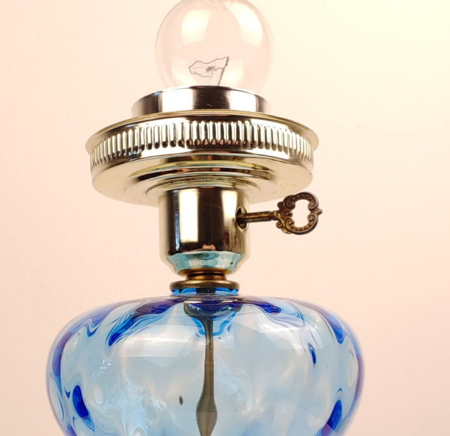 This lamp features a blue optic glass style body, which is actual blue glass (not flashed or stained with dyes). The base is white marble.