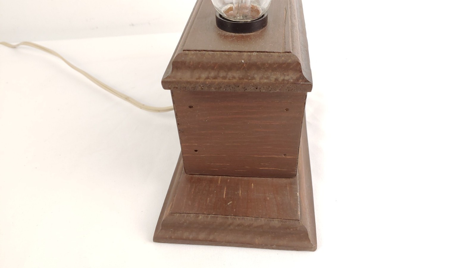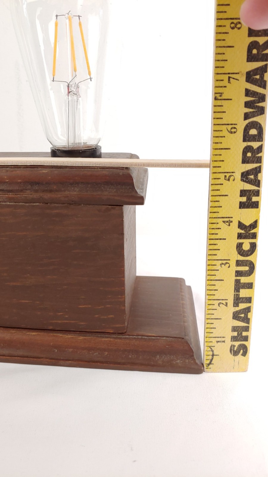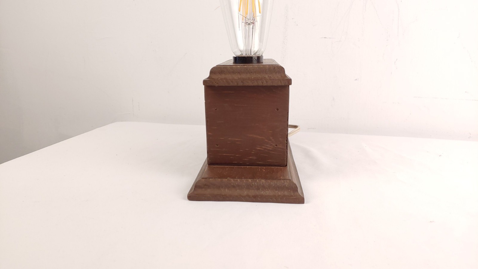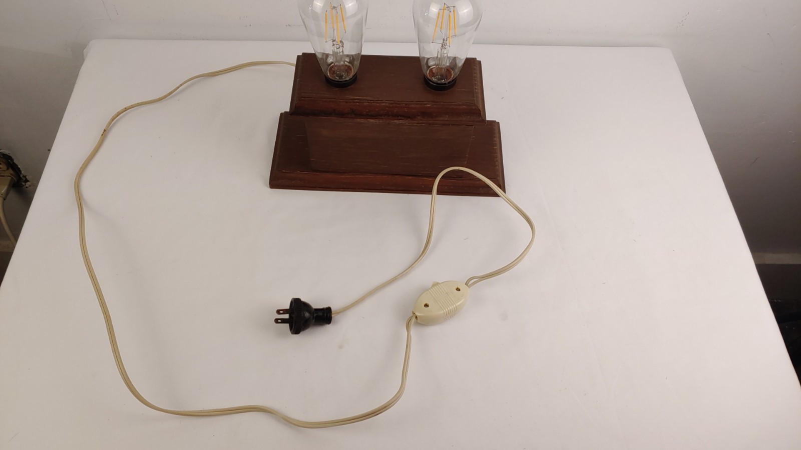 This is a one-of-a-kind handmade pine wood lamp, appears to be from the 1970s or so – perhaps it’s some woodshop class creation. We stuck some modern glass LED bulbs into it and it completes the look – it now gives off vintage or antique vibes. The cord has a hefty inline rocker switch.