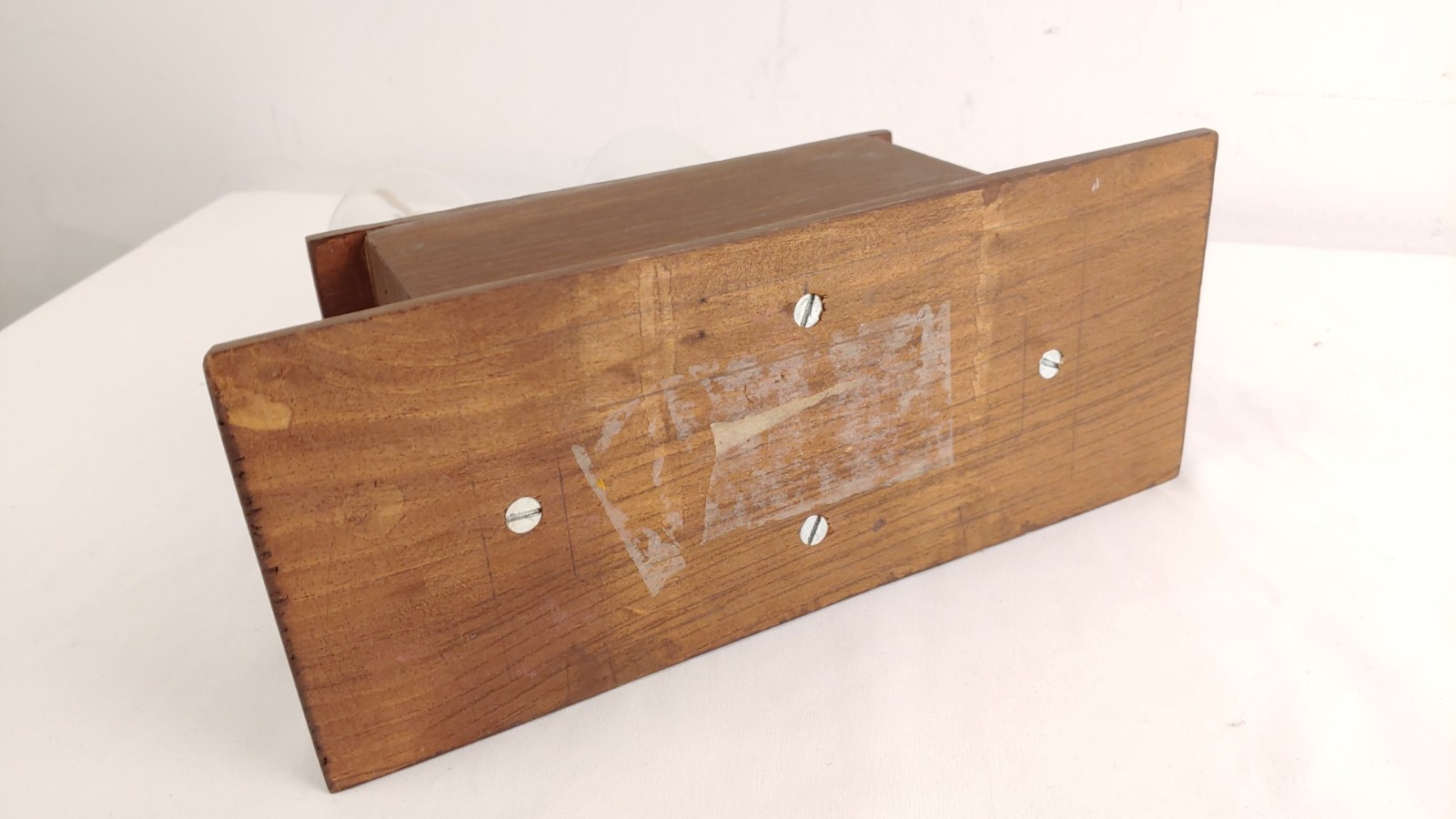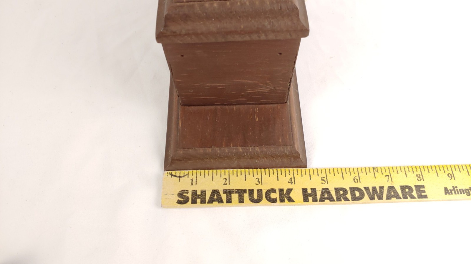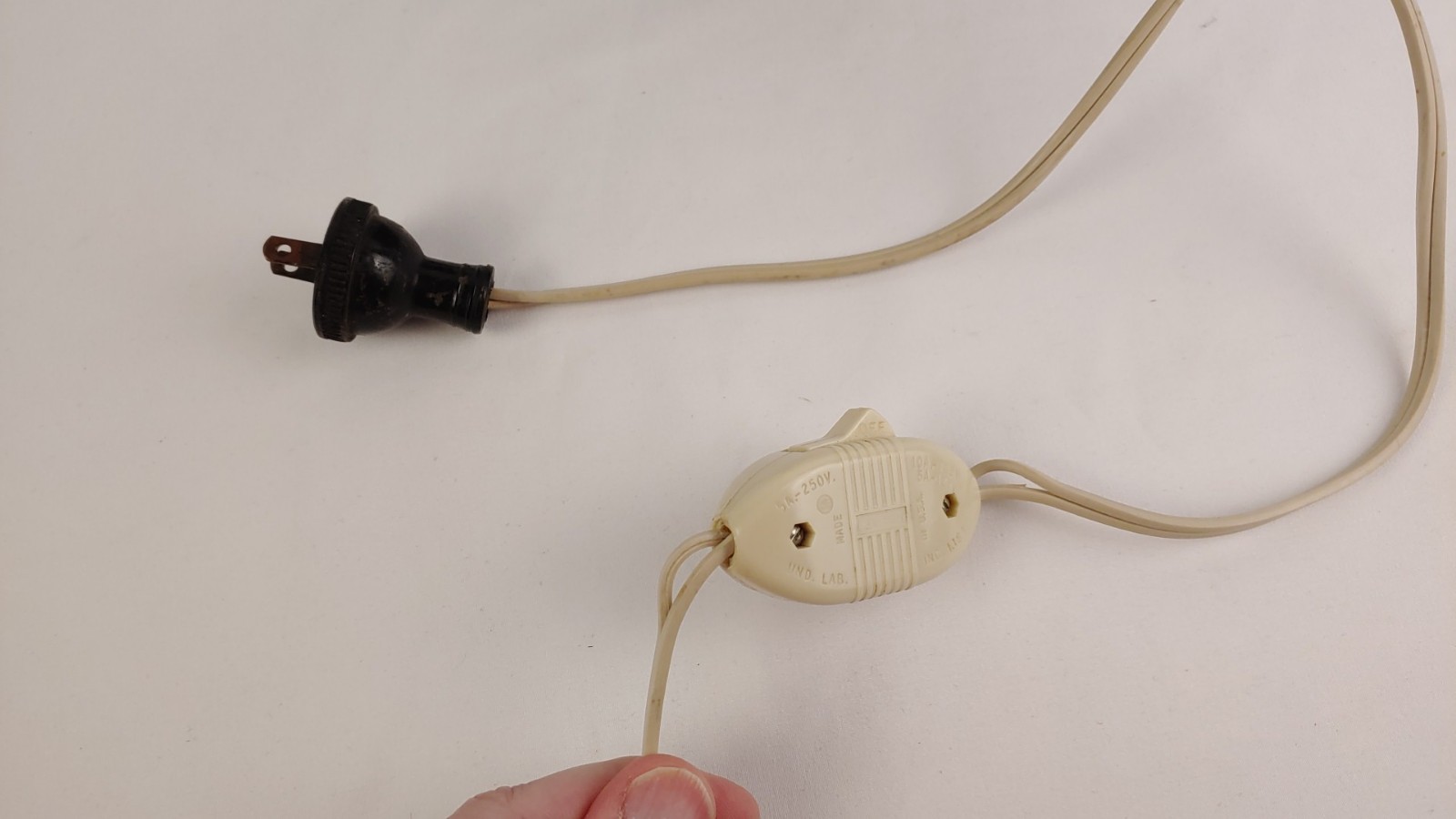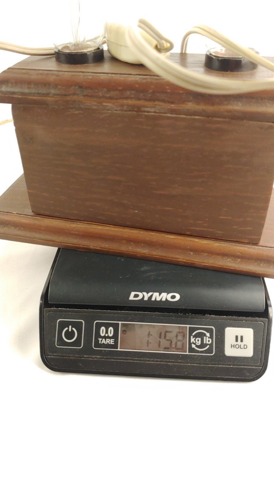 This is a one-of-a-kind handmade pine wood lamp, appears to be from the 1970s or so – perhaps it’s some woodshop class creation. We stuck some modern glass LED bulbs into it and it completes the look – it now gives off vintage or antique vibes. The cord has a hefty inline rocker switch.